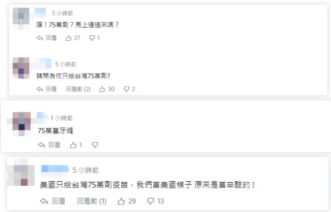 相比台媒的不满,台网友就表现得没那么克制了,在相关新闻评论区下,不乏网友质问美国:“莱猪吃了,废旧武器买了,棋子当了……75万剂,就这?”